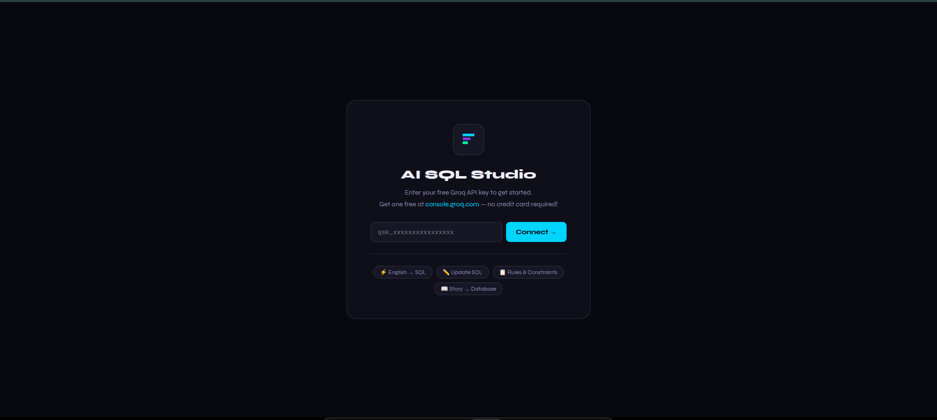 A full AI-powered SQL workspace built with React.js and Groq's Llama 3.3 70B. Convert plain English to SQL, update existing queries, apply database constraints, and generate complete schemas from a simple app description — all free, no backend required.