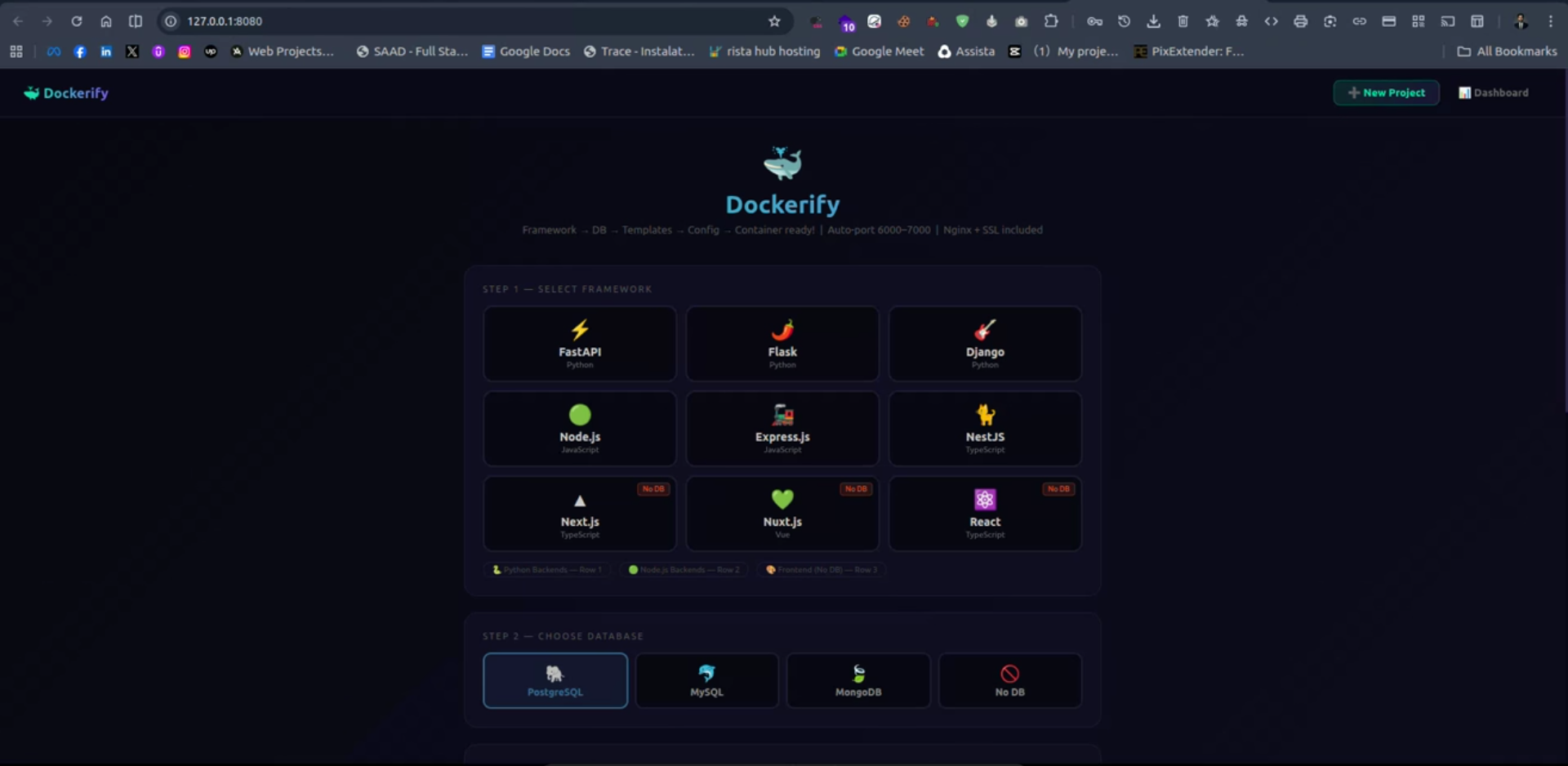 A FastAPI-powered automation tool that generates a complete, production-ready Docker setup for any framework in seconds. Input your framework (FastAPI, Django, Flask, Node.js, NestJS, Next.js, React) and database (PostgreSQL, MySQL, MongoDB, Redis) — it auto-generates a Dockerfile, docker-compose.yml, Nginx config, SSL certificate script, Docker Secrets, auto port finder, .env and .gitignore. Includes real-time WebSocket container health monitor, JWT auth, and OAuth2 login — all secured out of the box.
