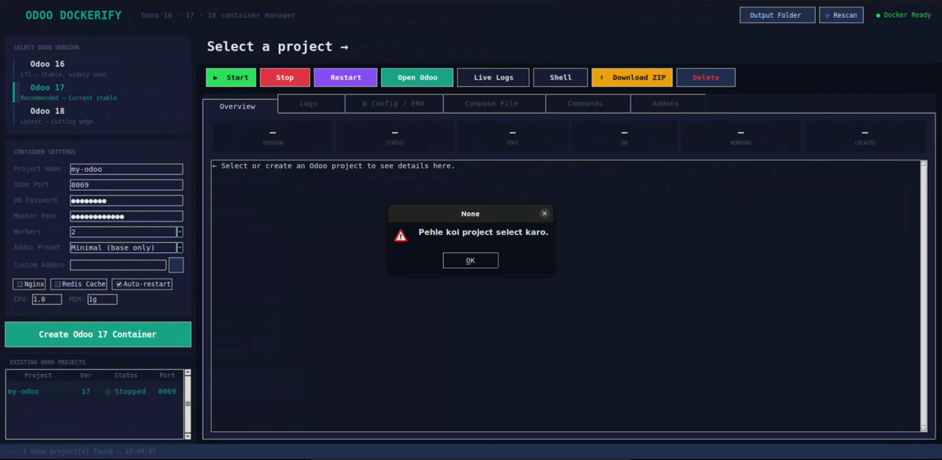A complete Dockerized Odoo stack with a custom Odoo module integrated directly into the platform. Supports Odoo 16/17/18 switchable via one env variable, PostgreSQL pre-configured, Nginx as reverse proxy with SSL, and a FastAPI container management backend (Dockerify API) running alongside Odoo. Custom addon adds a Dockerify menu inside Odoo with full project management views, custom models, security rules, and Kanban/List/Form UI — all launched with a single ./scripts/start.sh command.