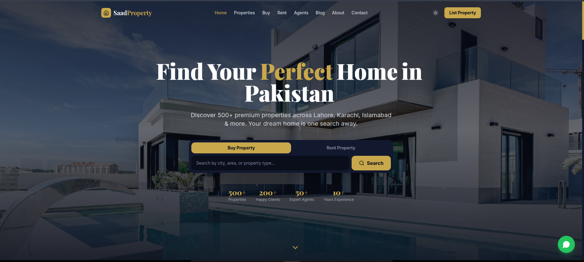 A fully animated, production-ready real estate platform built in React.js. Features 12 pages including Buy, Rent, Agents, Blog & Compare, advanced property search with city/price/bedroom filters, mortgage calculator with live PKR calculations, dark/light mode, property comparison tool, interactive maps, image gallery with lightbox, and agent profiles with WhatsApp CTAs.