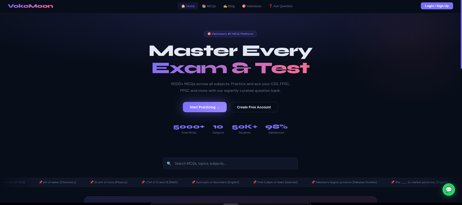 A full React.js frontend built for a client targeting Pakistani competitive exam aspirants (CSS, FPSC, PPSC & NTS). Features 10 subject categories, 100+ MCQs with instant answer checking and explanations, practice sets with pagination, score tracker, blog and community Q&A sections, login modal with multiple auth options, and an animated dark-themed UI — ready to plug into any backend.